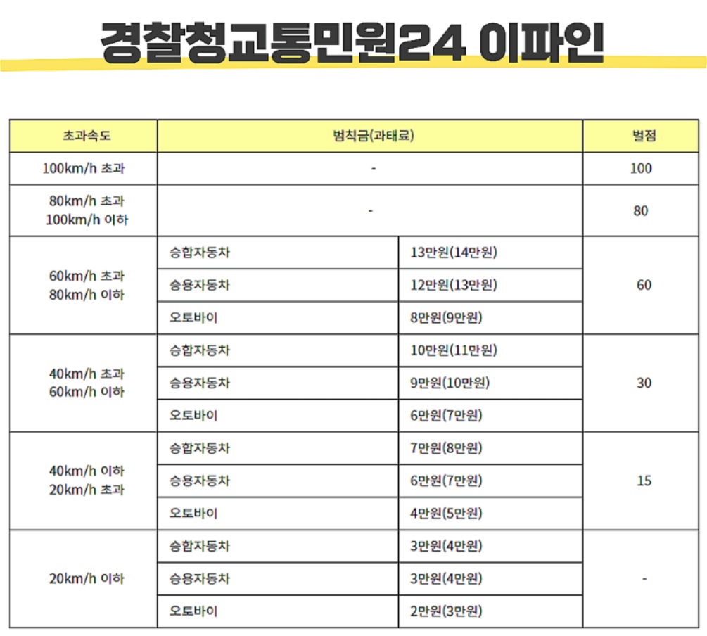 - 과속 과태료 : 제한 속도를 초과하여 운전할 경우 부과됩니다.