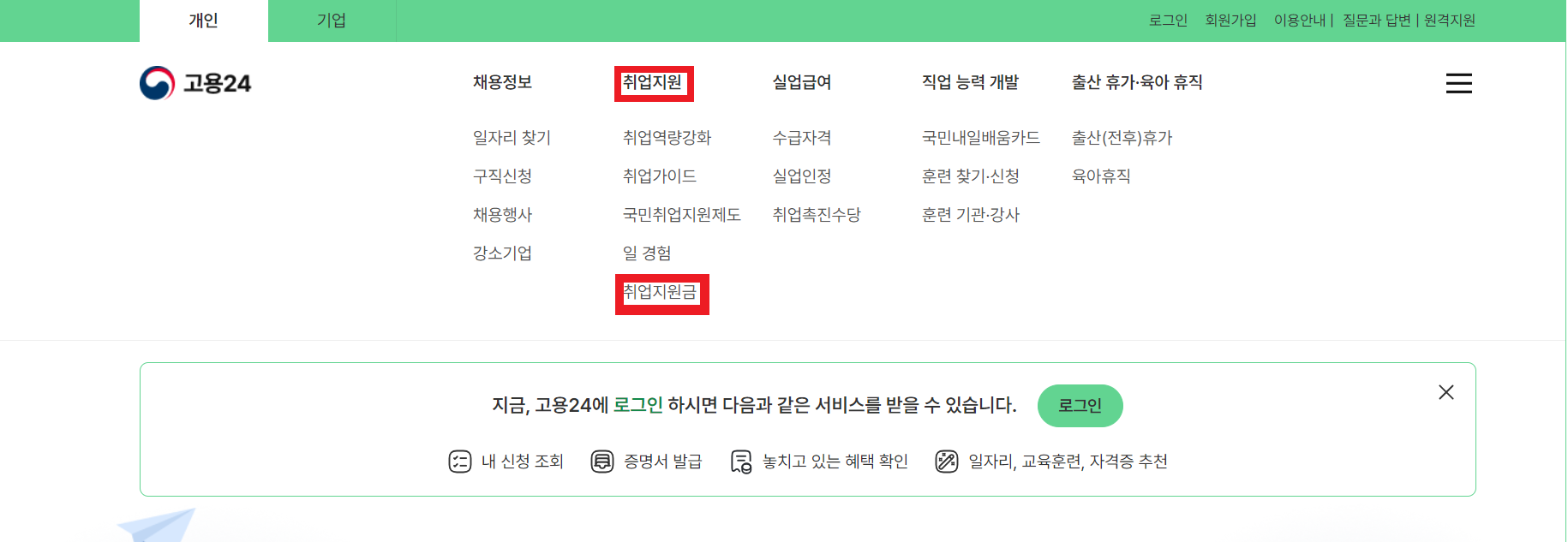 1. 로그인 및 인증 : 고용24 홈페이지에서 아이디, 비밀번호 로그인 후 공동인증서를 등록합니다.