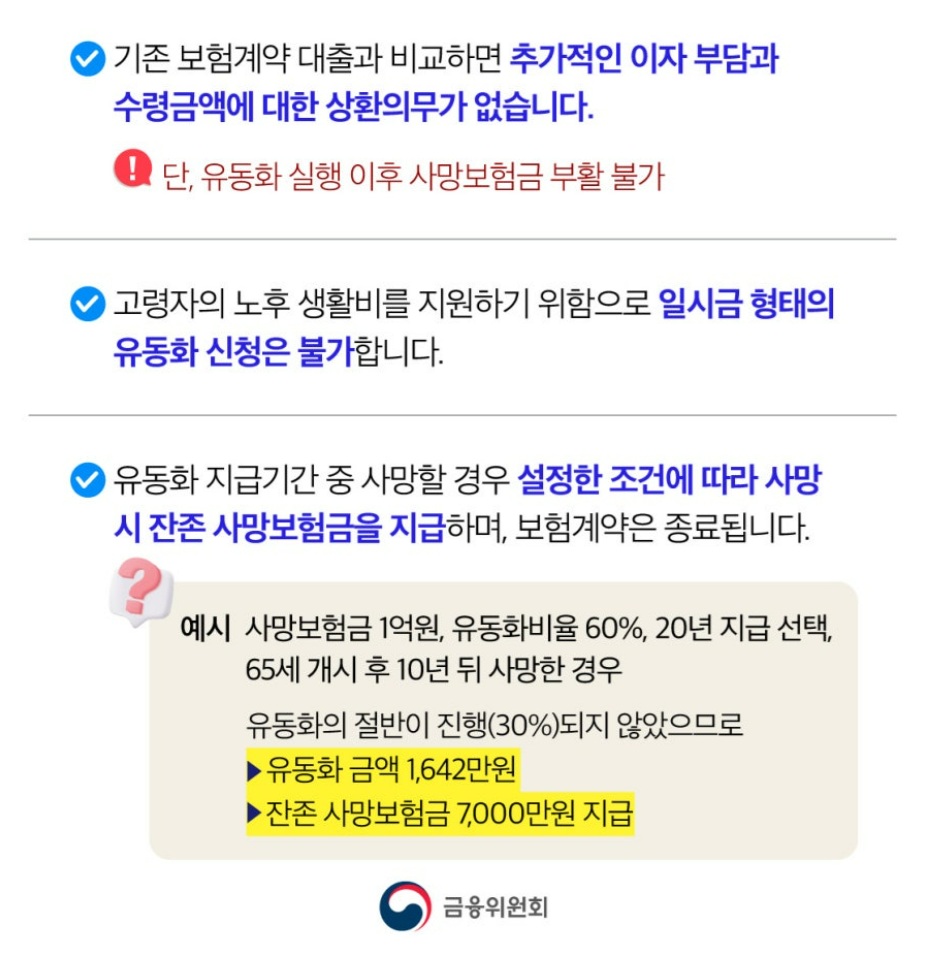 - 사망보험금 감소 : 유동화한 만큼 최종 사망보험금이 줄어듭니다.
