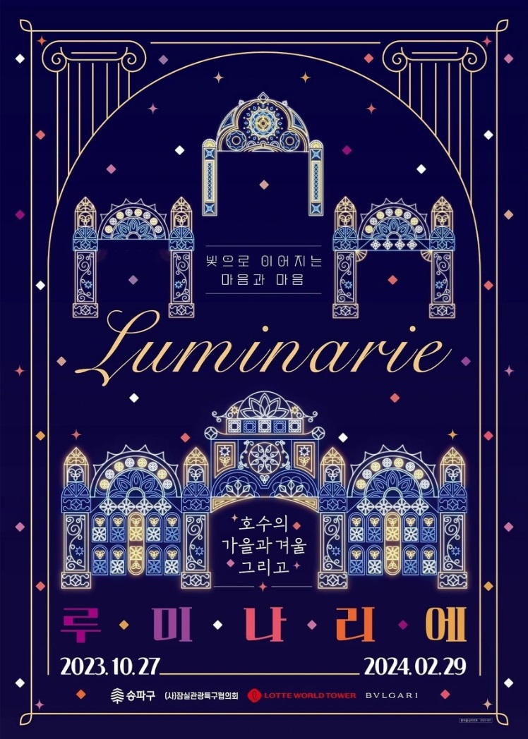 석촌호수 동 서호 일대에서 ‘빛으로 이어지는 마음과 마음’이라는 주제로 ‘호수의 가을과 겨울 그리고 루미나리에 축제가 개최된다. 2023년 루미나리에 라는 새로운 컨셉을 도입하여 큰 호응을 얻은 본 축제는 올해도 다양한 경관조명, 빛조형물, 포토존을 설치하여 빛의 향연을 펼친다. ’루미나리에‘는 조명으로 건축물을 만들거나 치장하는 축제로서 빛의 예술 또는 빛의 조각이라고도 한다.