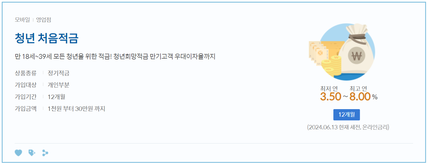 청년층 고객의 듬융 지원 강화를 위해 최고금리 연 8%로 상향한(기본 연 3.5% +우대이자율 최고 연 4.5%, 2024년 6월 7일 현재, 12개월, 세전기준) 『청년 처음적금』을 10만좌 한도로 판매하고 있습니다.