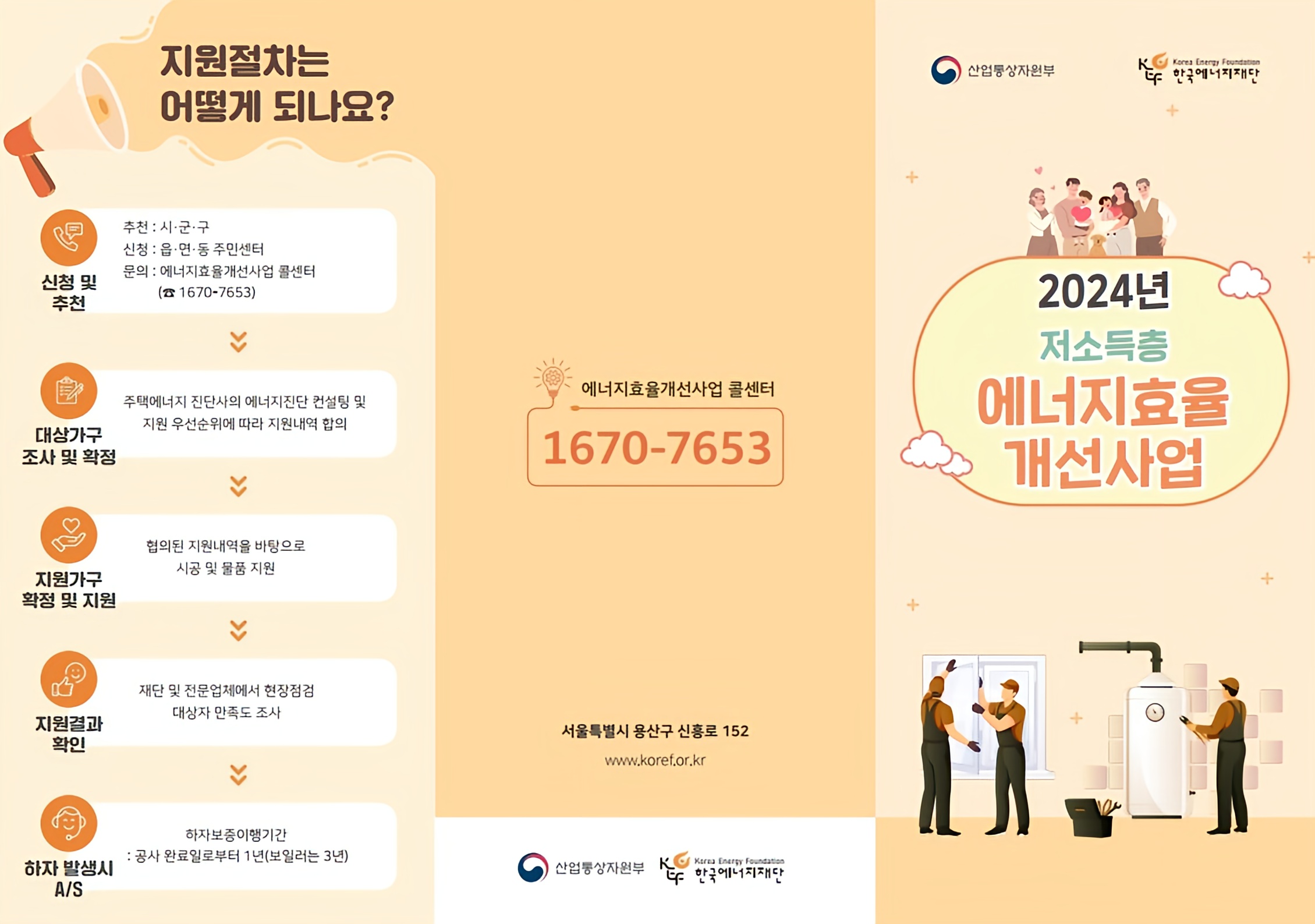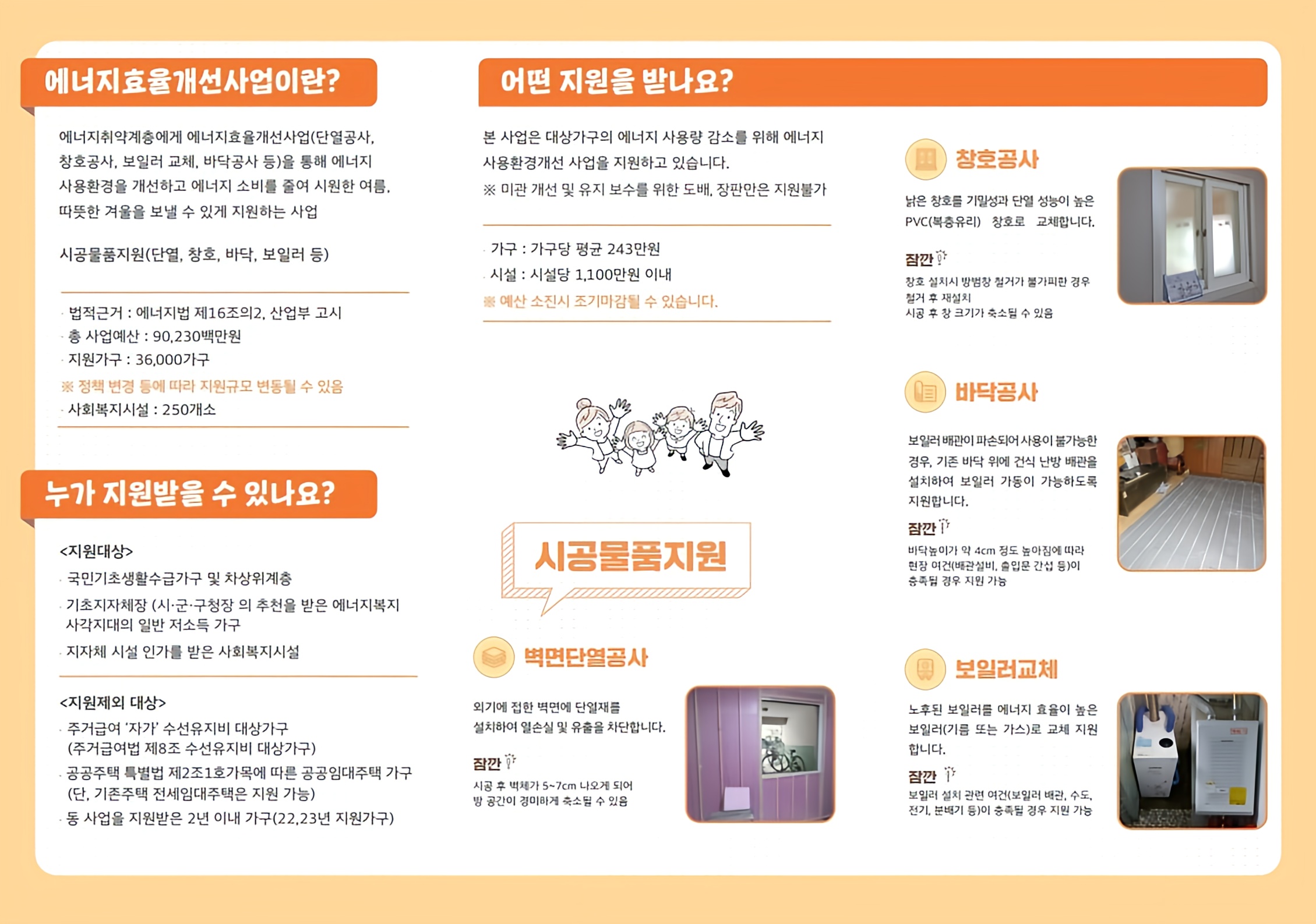 - 난방지원사업 : 겨울철 난방비 부담을 줄이기 위해 건물 단열 시공, 창호 교체, 고효율 보일러 설치 등을 지원합니다.