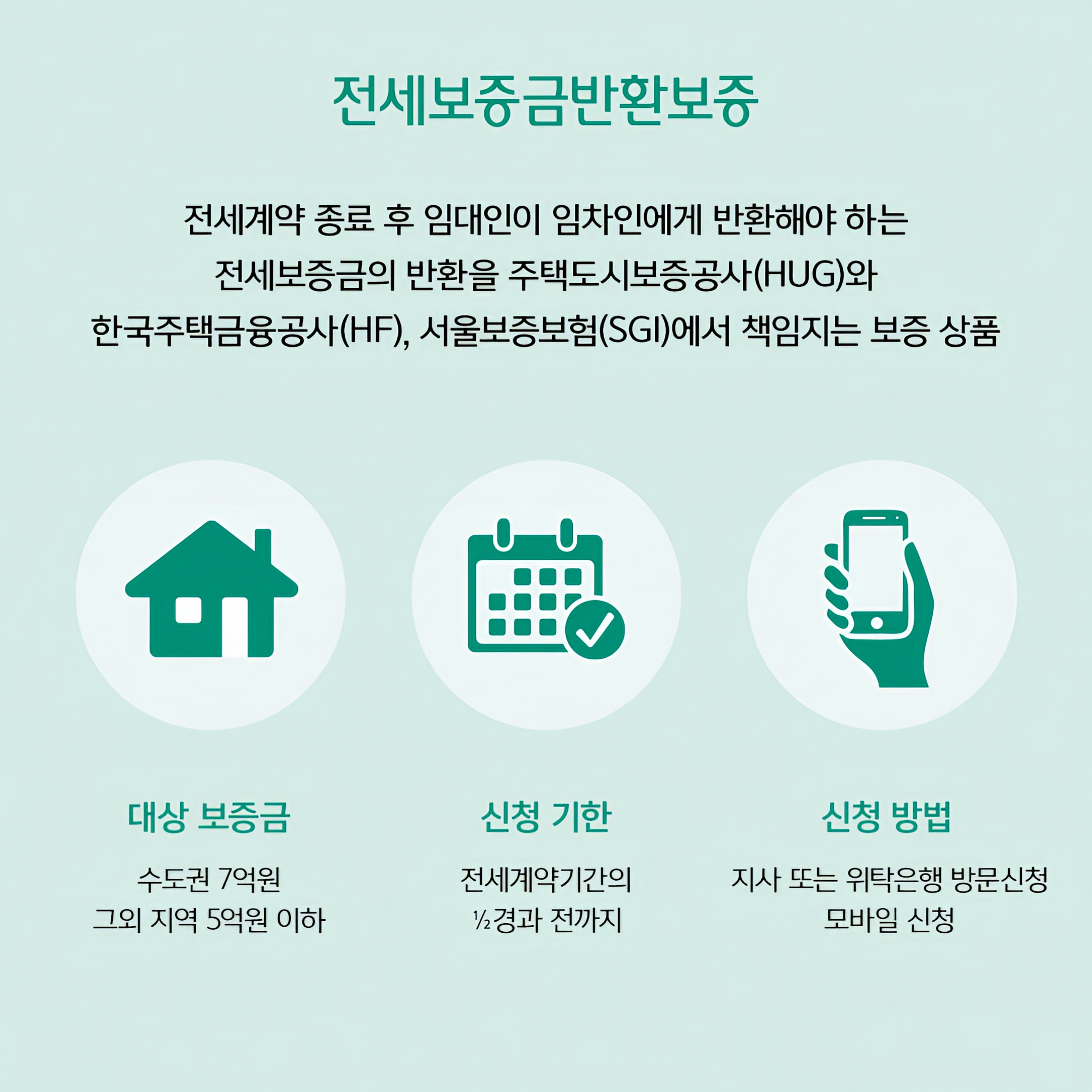 - 신청 가능 보증기관 : HUG(주택도시보증공사), HF(한국주택금융공사), SGI(서울보증보험).
