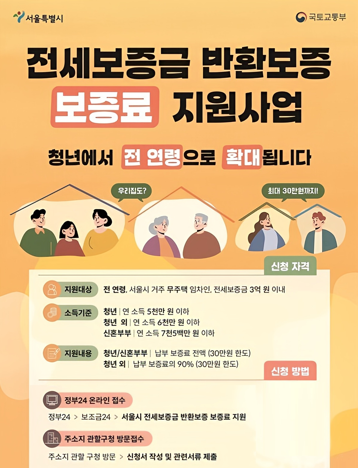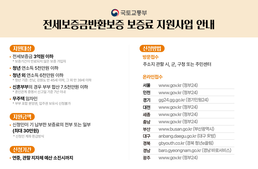 - 보증료 지원 : 전세보증금반환보증보험 가입 시 납부한 보증료를 최대 30만 원까지 환급.