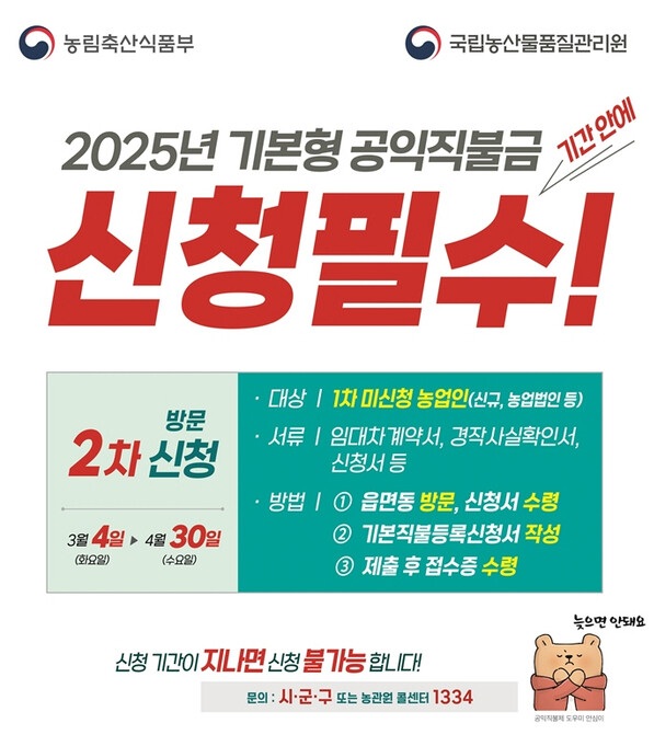 "농민 여러분의 노력에 대한 정당한 보상, 지금 바로 공익직불금을 신청하세요!"