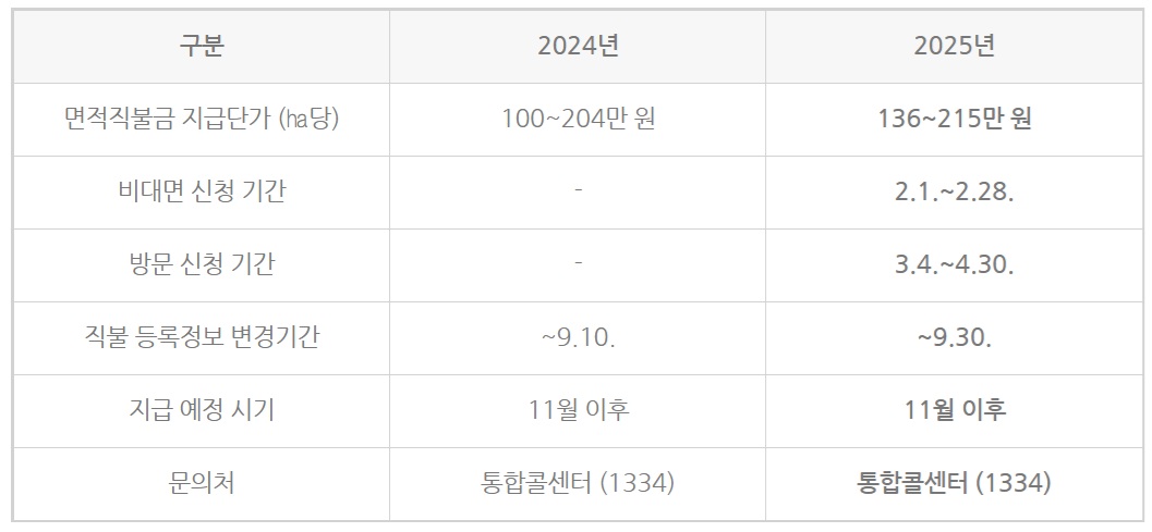- 특히, 올해는 직불금 지급 단가가 평균 5% 인상되어 더 많은 혜택을 받을 수 있습니다.
