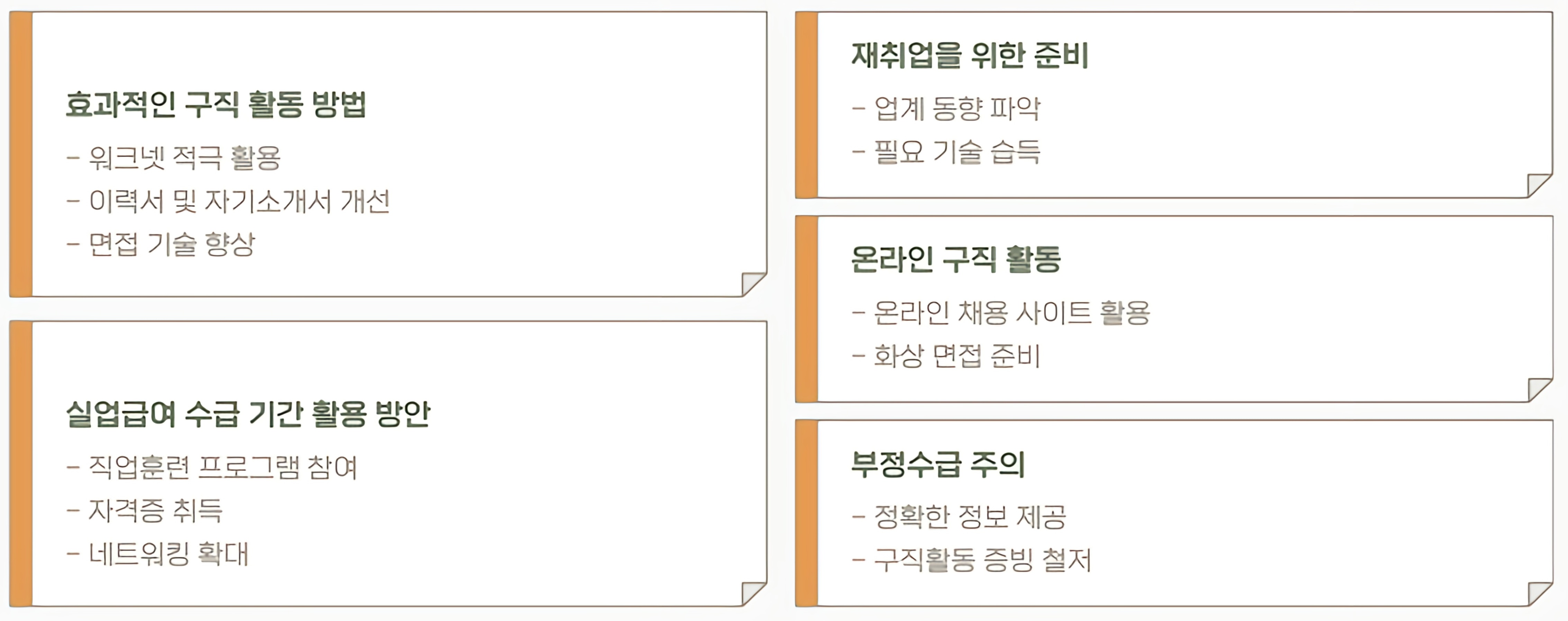 - 워크넷 활용 : 워크넷에서 제공하는 구직 정보와 교육 프로그램을 적극 활용하세요.