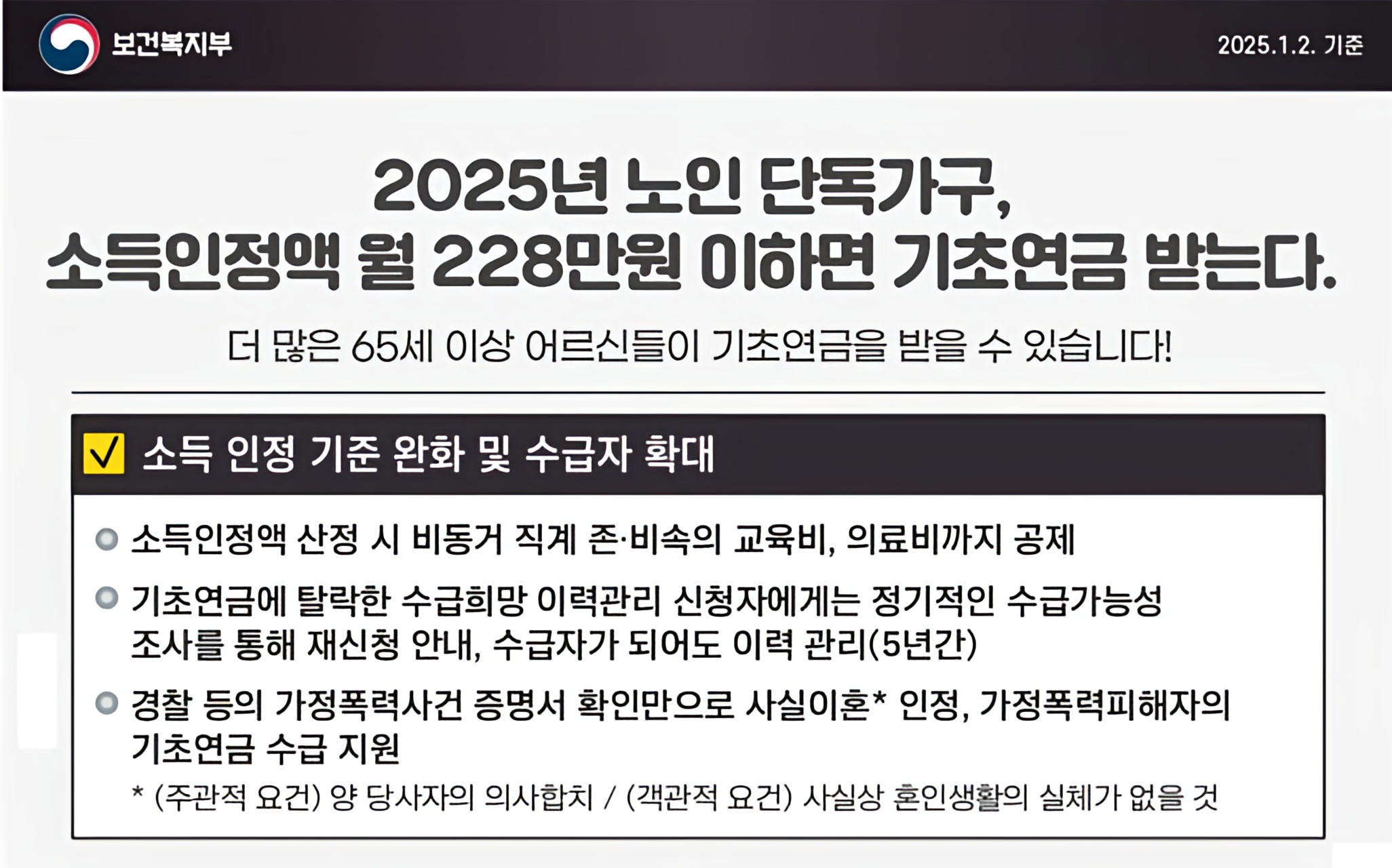 2025년에는 기초연금 수급 조건과 관련된 몇 가지 중요한 변화가 도입됩니다.