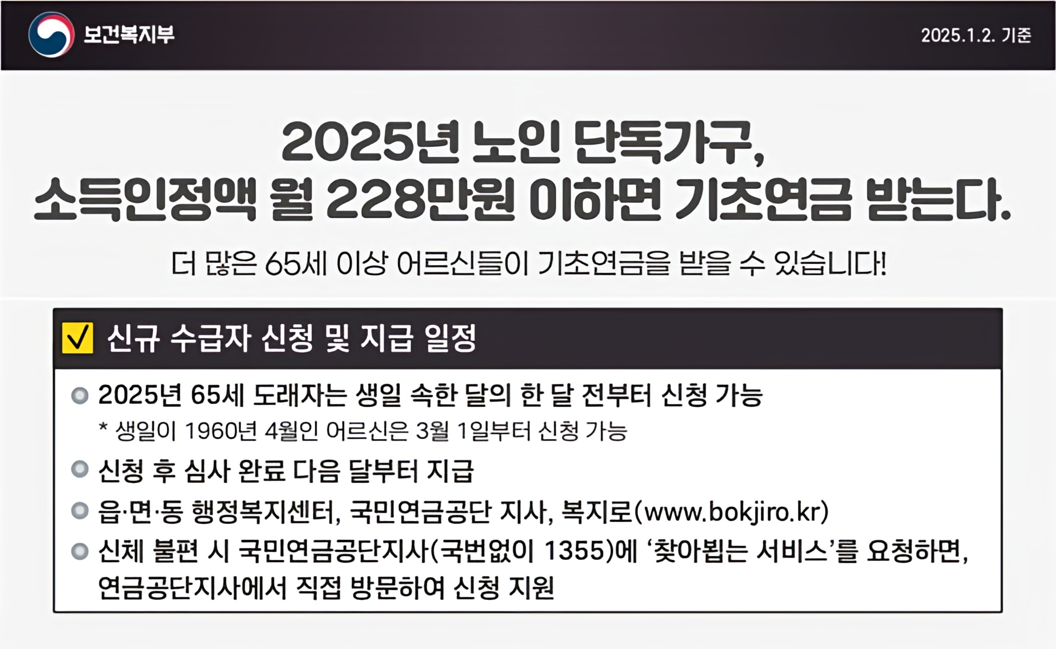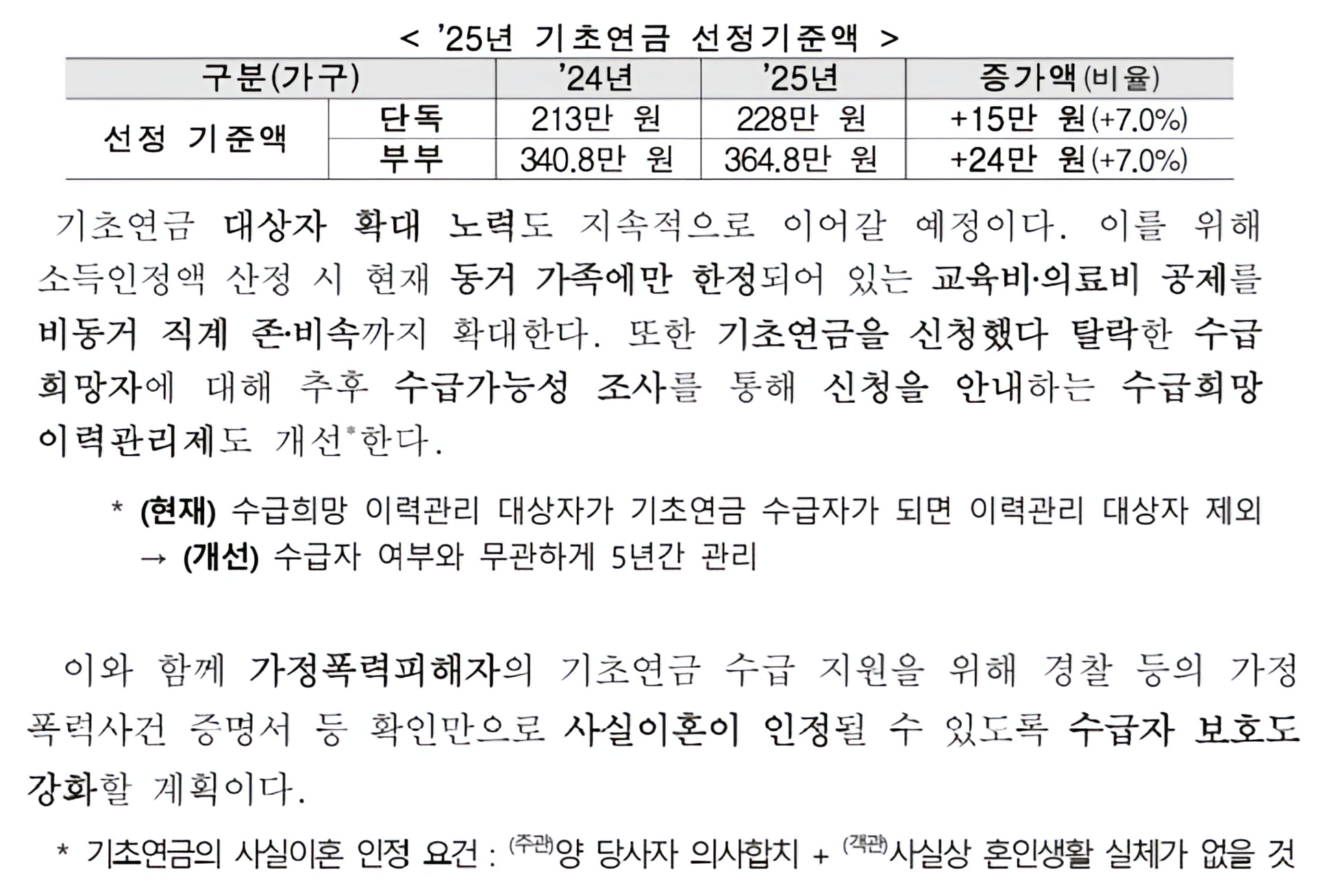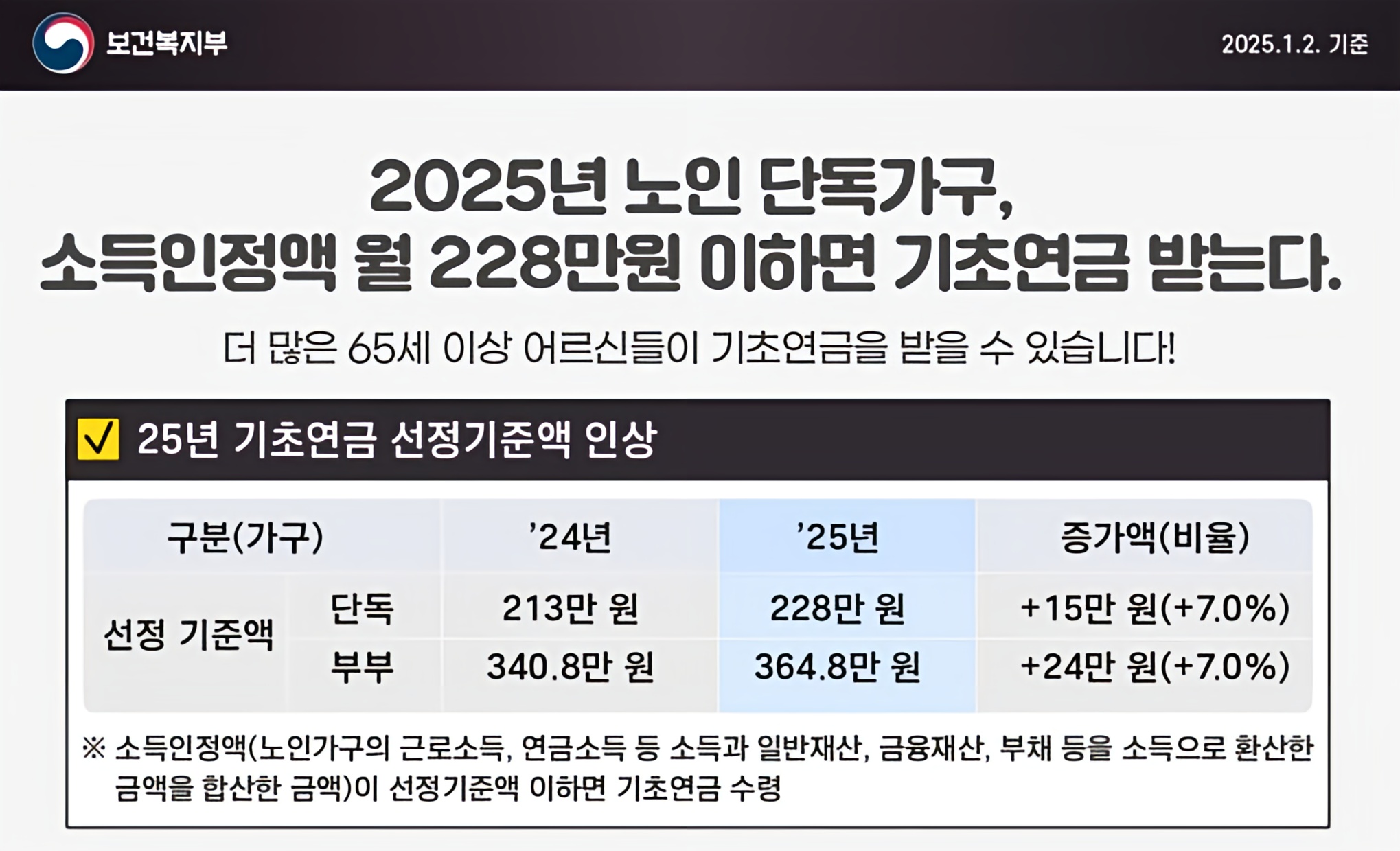 이는 물가 상승률(2.3%)과 생활비 증가를 반영한 조치로, 더 많은 어르신들이 혜택을 받을 수 있게 되었습니다.