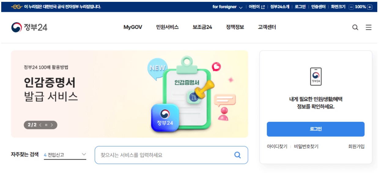 - 정부 24 홈페이지에 접속하거나 앱을 실행합니다.